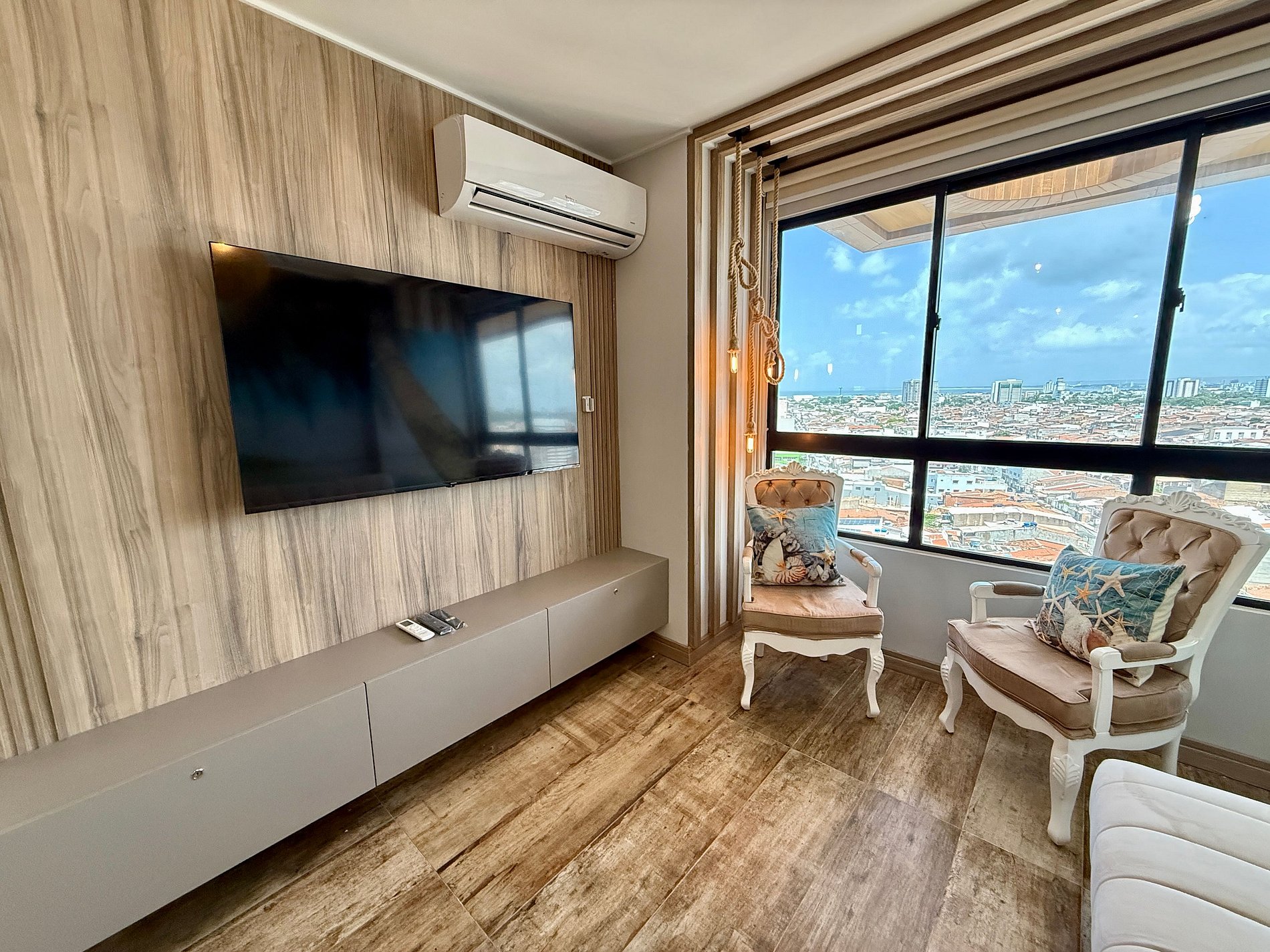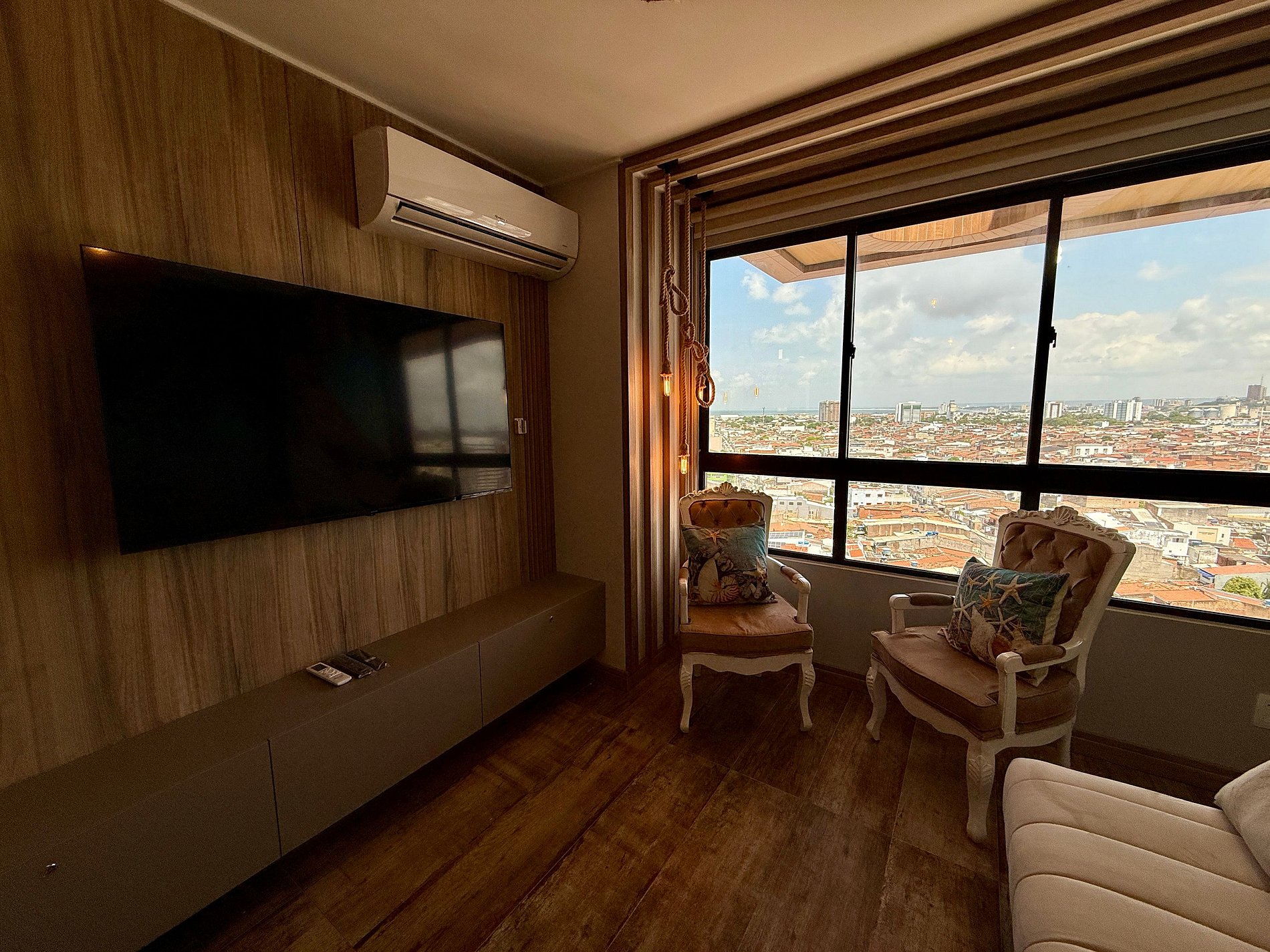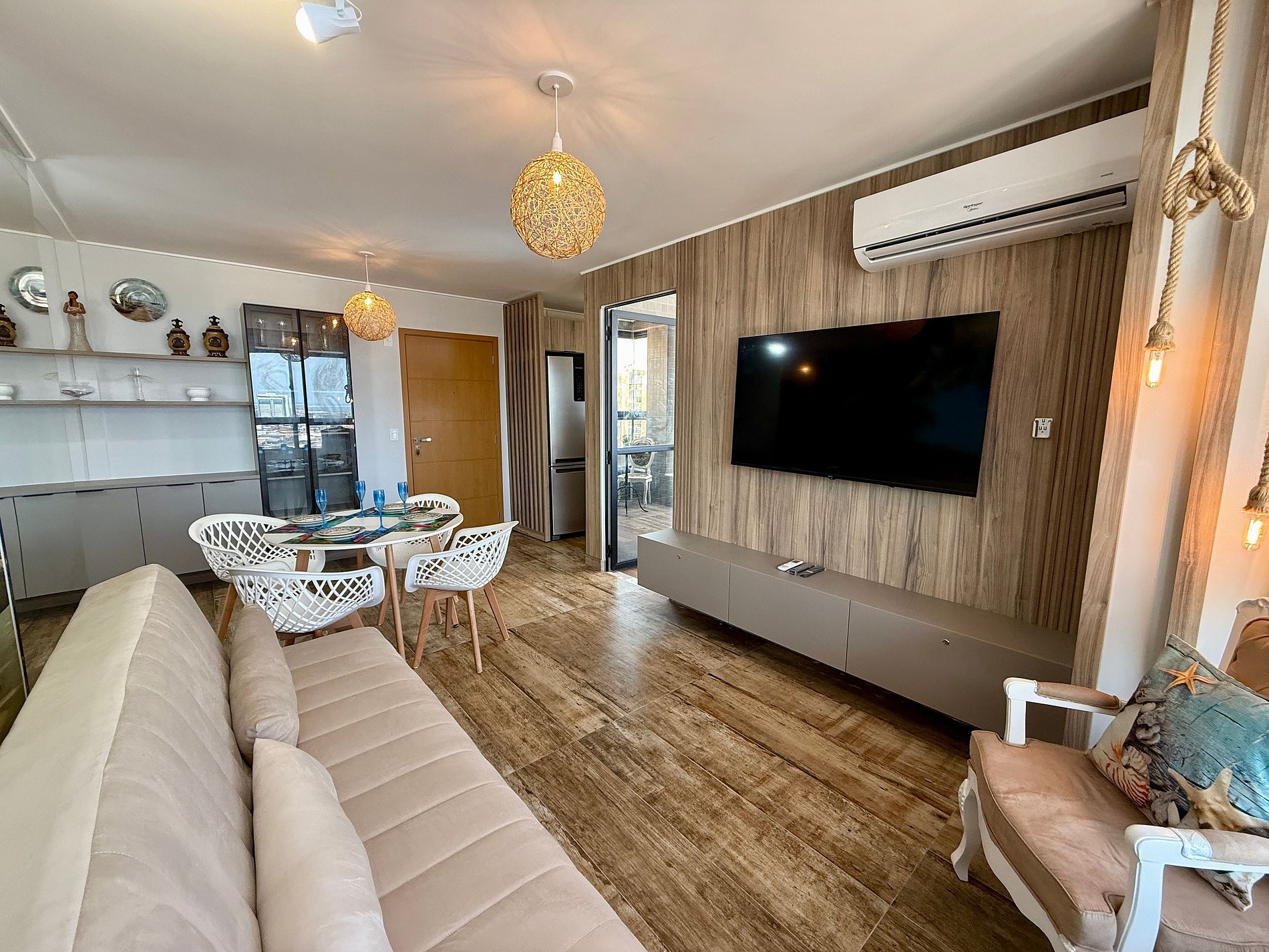 Sala aconchegante com Smart TV 50 polegadas, compatível com aplicativos de streaming (mediante uso da senha do hóspede)