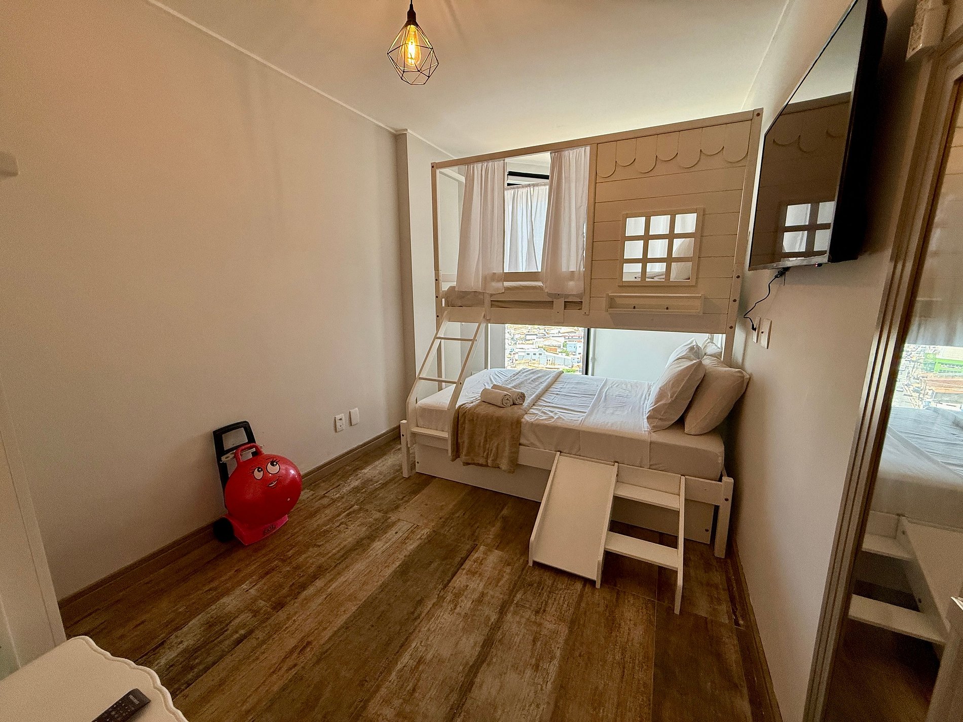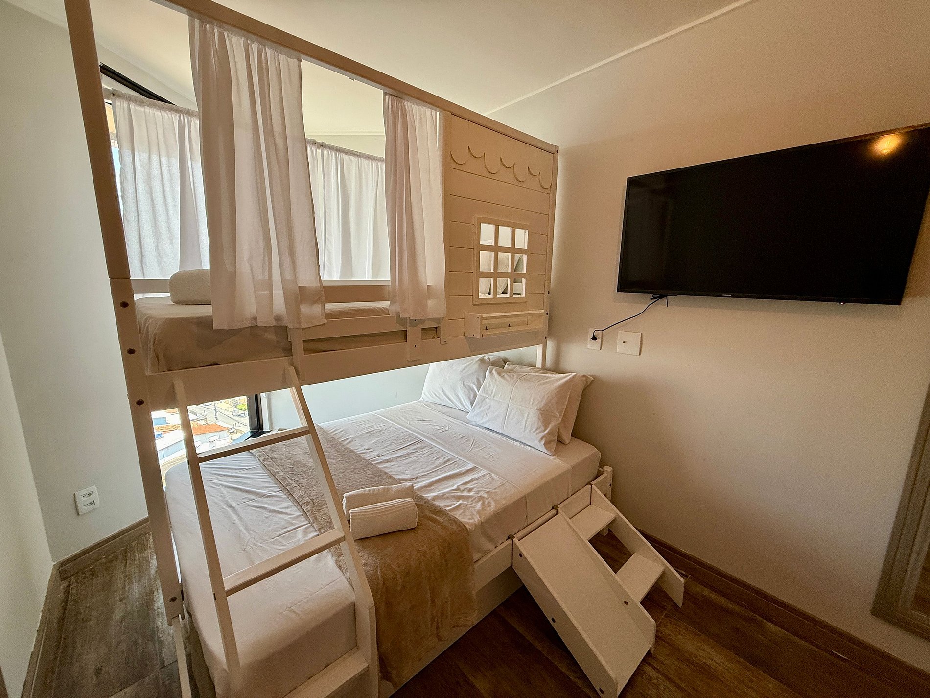 • 1 Quarto social com cama casal queen + bi cama solteiro + cama de solteiro