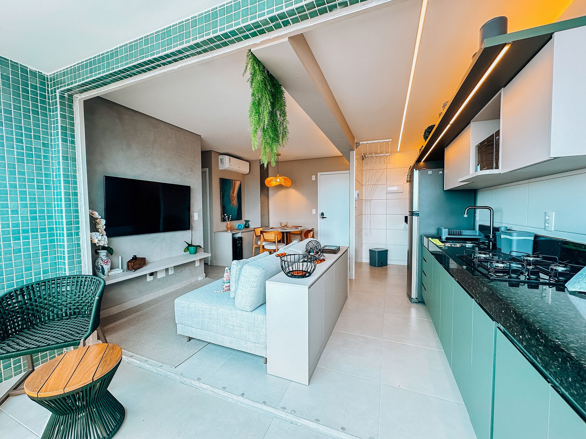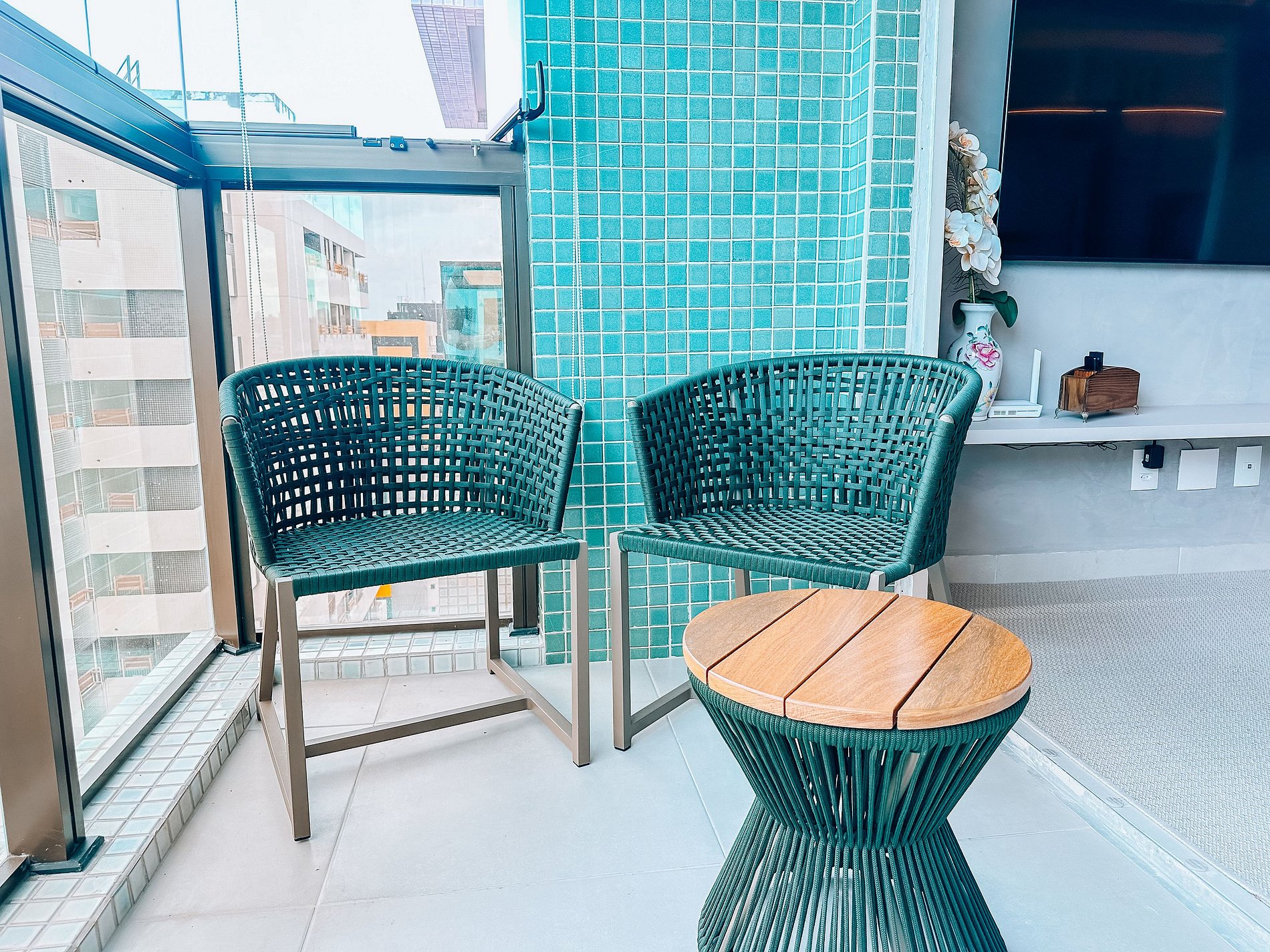 Varanda com bancada para churrasco, frigobar e mesinha com duas cadeiras