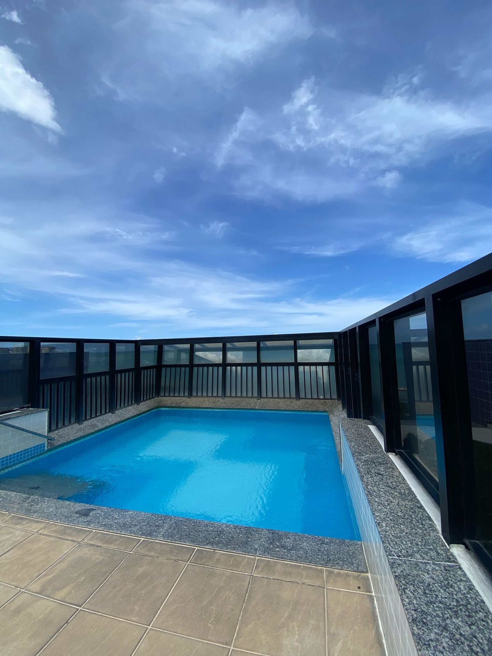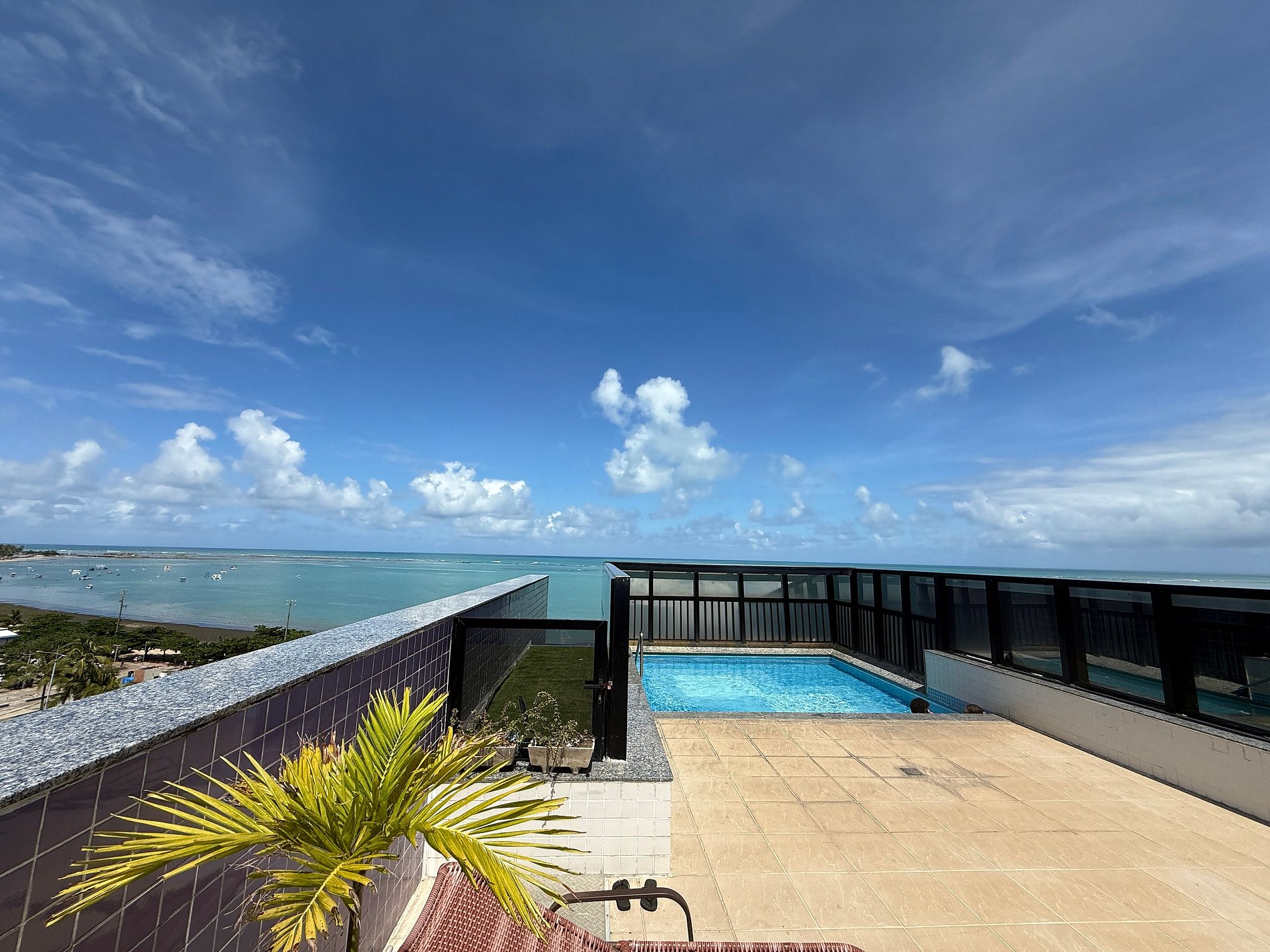 Edifício com piscina na cobertura com vista para o mar.
