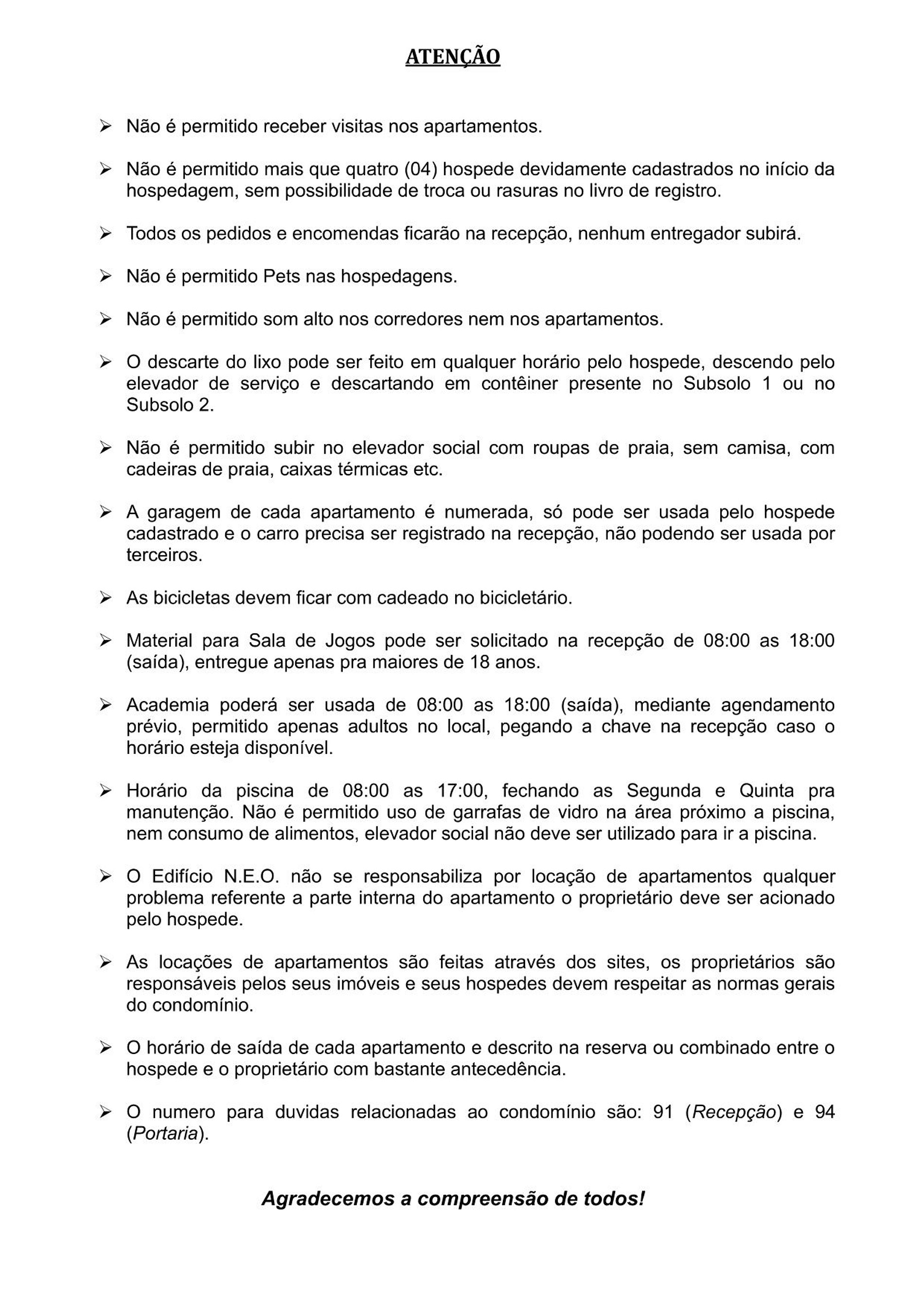 O edifício funciona 24 horas, mas para qualquer dúvida ou necessidade, pedimos que entre em contato diretamente com a equipe da Mandi Hospitalidade, que está à disposição todos os dias, das 08h00 às 18h00.